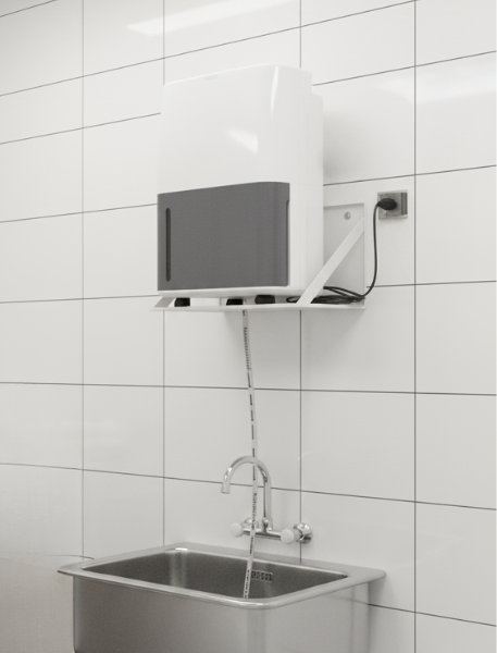 - Pompe à condensat: la pompe à condensat est placée directement dans le réservoir du déshumidificateur et fixée au fond du réservoir au moyen de ventouses. Une pompe permet de vider le réservoir de condensat vers le haut (dans une évacuation surélevée, vers l'extérieur par une fenêtre, etc.) La taille de la pompe dépend de la hauteur à laquelle l'eau doit être pompée.